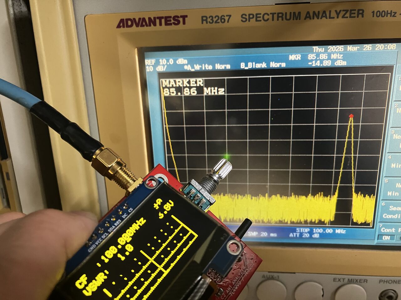 IFフィルターは水晶3個をラダー型にしたものです。インピーダンスが合っていないので凸凹になっていますが復調キャリア周波数を求めるために特性をしっかり確認しておきます。写真で帯域は約800Hz程度。水晶3個でもCWの狭帯域だと結構実用になるものが作れます。このピーク周波数11.058350MHzに対して、600Hz程度下の周波数を発振させてプロダクト検波することで復調ができます。