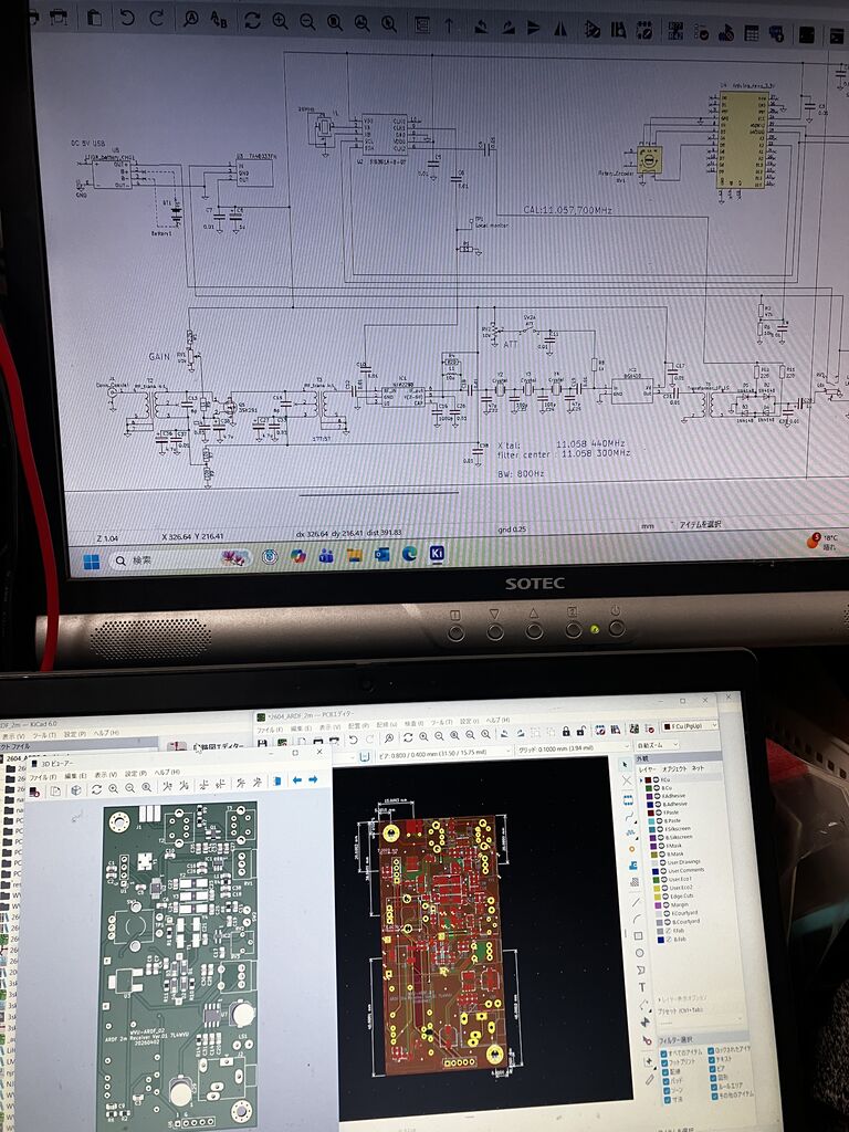 とりあえず、基板がないと実験が進まないので、基板設計をして3.5MHzと144MHz、それぞれ発注しました。10日くらいで届くと思いますが、最初はアンテナ実験をしたいので3.5MHzから進めたいと思います