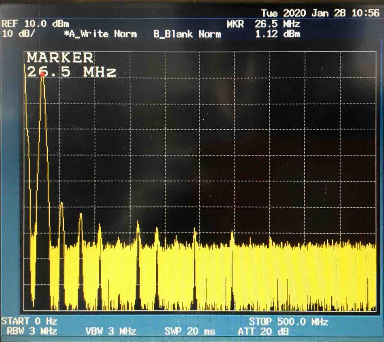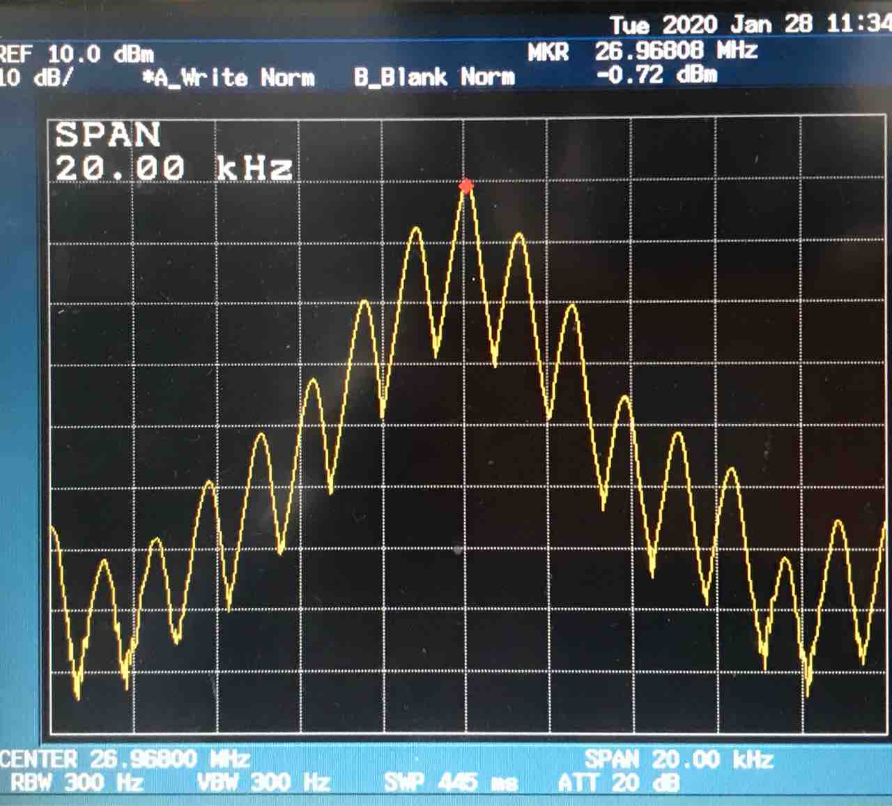 2020年01月28日 自作CBトランシーバーの製作 その5 試作2号機 送信特性 試作2号機は、電池のアンテナへの干渉を避ける部品配置と受信用水晶フィルターをつけたのが大きい変更点です。受信は、かなり改善しました。アンテナが短いのでそれなりですが、まあまあ聴こえます。天気の良い日にフィールドで市販機と比較してみようと思います。また、送信回路は変更していませんが、確認の意味で測定しました。出力は200mW1.送信出力、周波数偏差出力は、200mWまで出るようになりました😄。周波数は、100Hz以内に納まっています。2.送信スプリアス 200mW3.送信スペクトラム、変調波形4.受信時の不要輻射にほんブログ村 にほんブログ村にほんブログ村