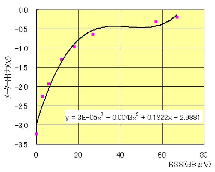 このテーブルをエクセルでプロットして近似式を求めてソフトに書き込んでアナログ出力を得るような回路にしました。下表からも分かるようにメーターでは,30dBμⅤくらいまでは細かく表示できますが、それ以上はあまり変化しません。
